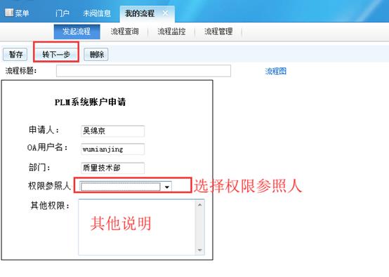流程标题可以不填,权限参照人可以询问部门长,转下一步既可,用户名和密码会在流程提示中给到申请人,如图: