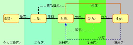 ——文档发布区(紫色图标)——文档报废区(灰色图标)——文档回收区